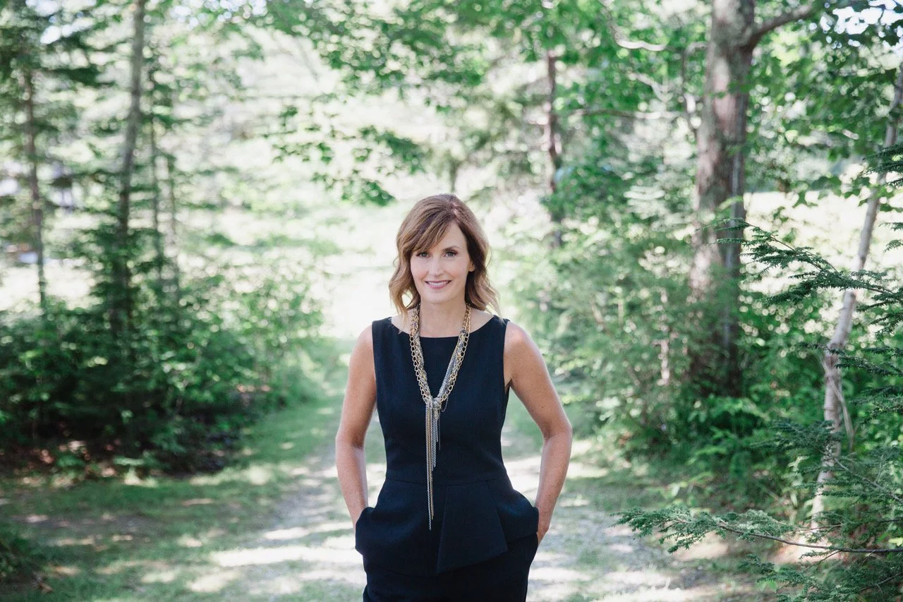 A woman with shoulder-length brown hair, wearing a black sleeveless top, red pants, and a silver necklace, smiling while sitting outdoors in a green forested area.